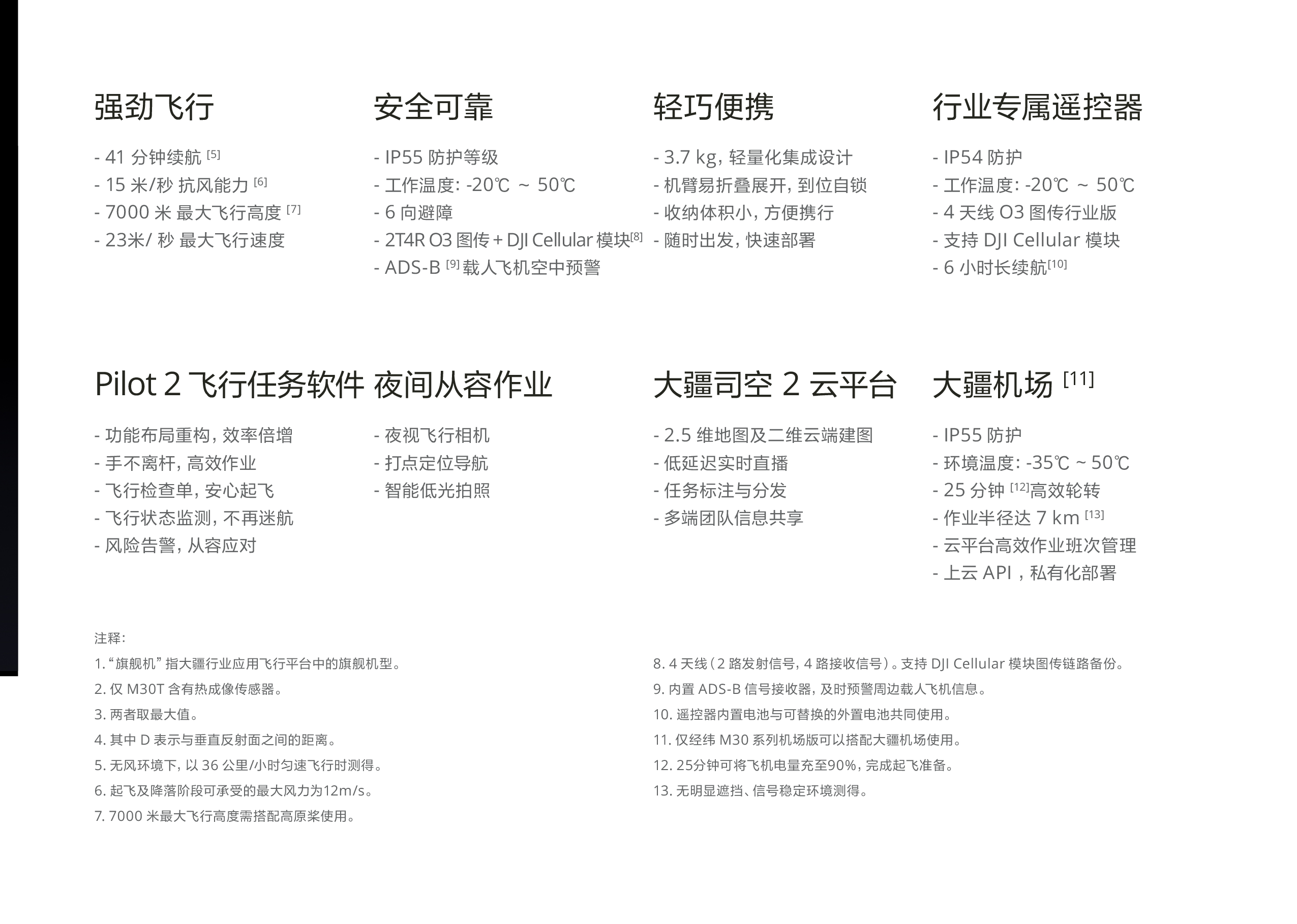 經緯M30系列無人機,集成廣角、變焦、熱成像及激光測距傳感器,輕巧便攜,風雨無阻,操作體驗升級,支持大疆司空2云平臺,高效空地協同,支持大疆首個機場,實現無人值守作業。機身結構精悍,動力系統強勁,帶來更高的作業效率。具備41分鐘續航,支持7000米海拔高度起飛,最大飛行速度23米/秒。無人機具備 IP55 防護等級,工作環境溫度范圍達 -20° C~50° C ,可輕松應對極端惡劣環境。整機搭載六向雙目及紅外傳感器,全方位避障,保障飛行安全。內置 ADS-B 信號接收器,可及時預警周邊載人飛機信息。經緯 M30 系列的飛行器系統和傳感器具備多重冗余系統,讓你放心應對惡劣作業環境與重大任務,為不時之需做好準備。具體包括:飛控傳感 器冗余、感知系統冗余、動力系統雙鏈路冗余、雙智能電池冗余、圖傳鏈路冗余等。