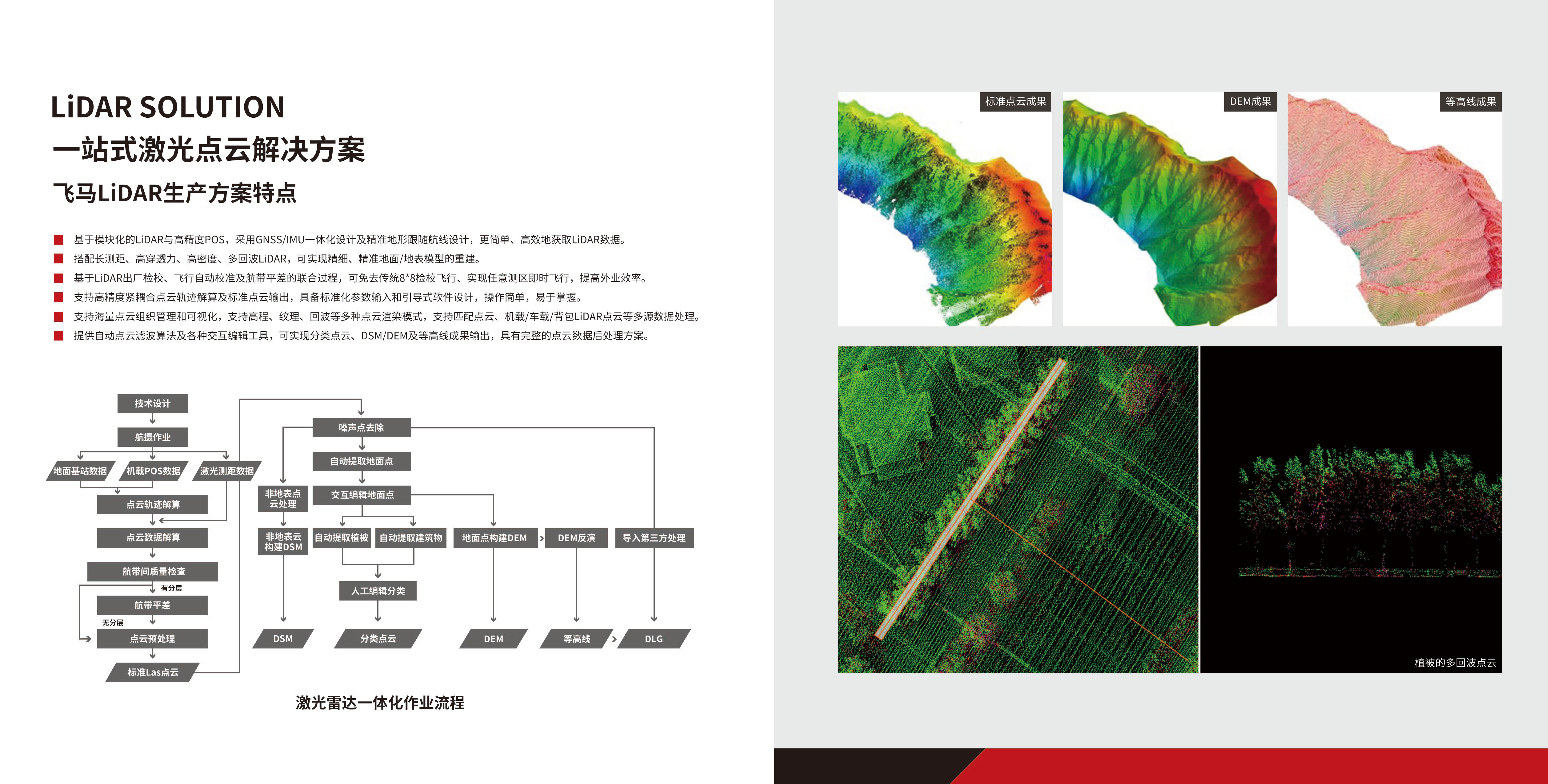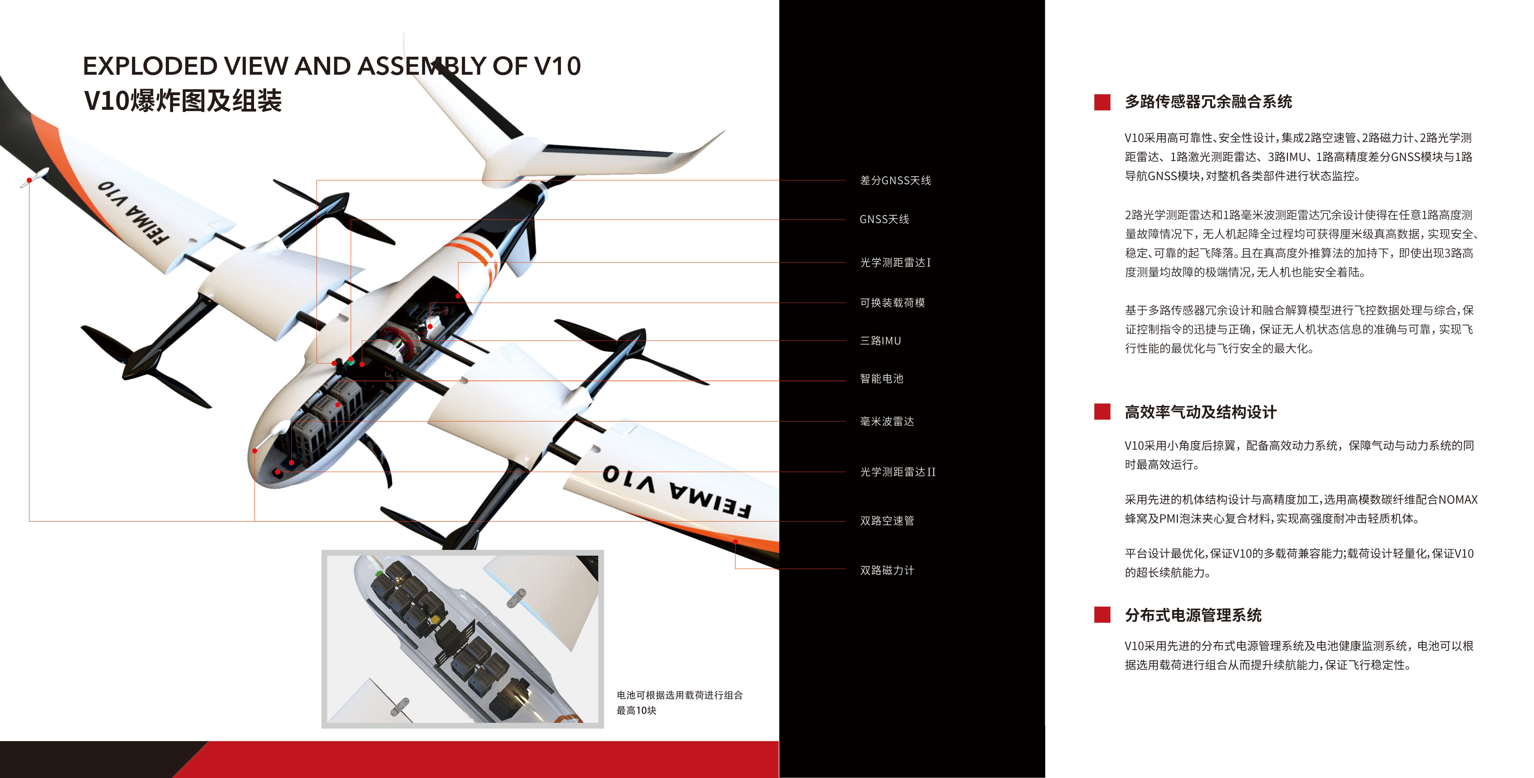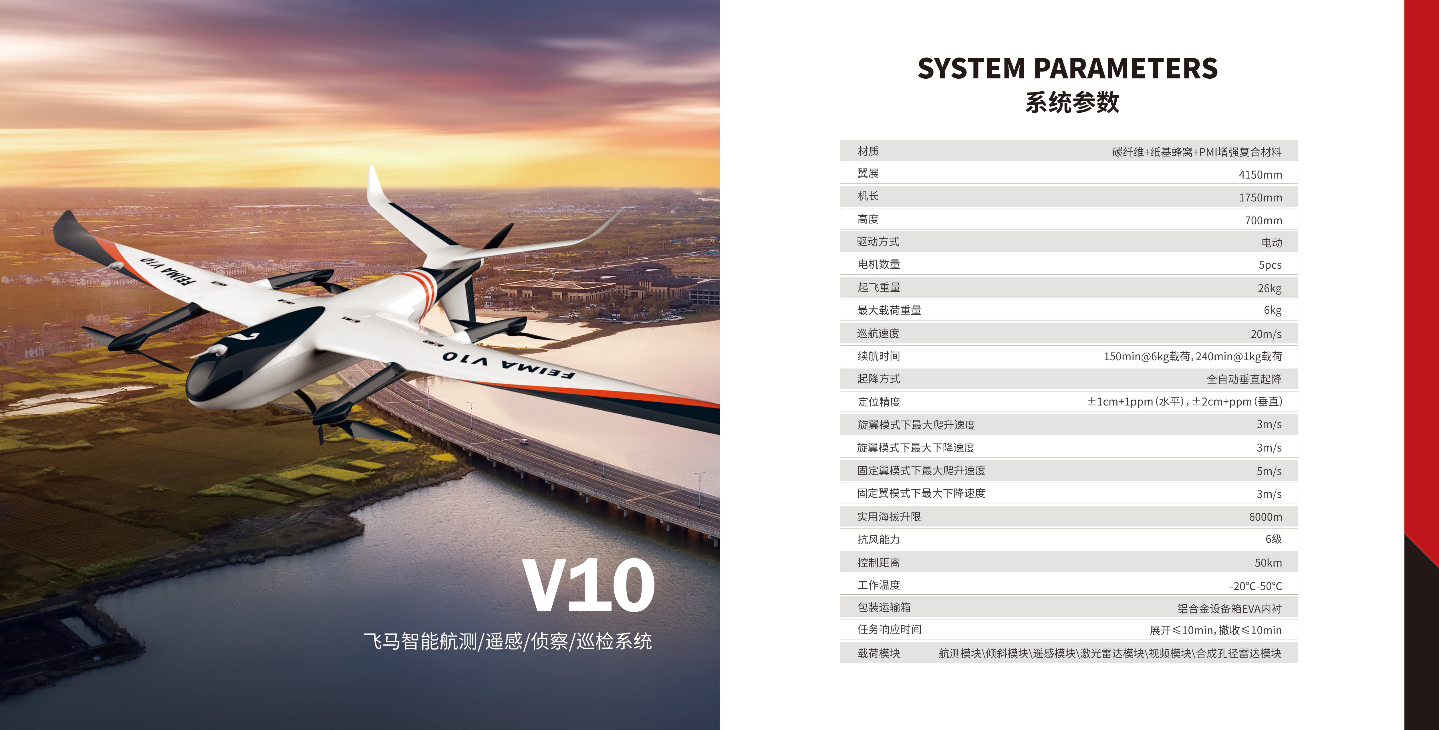 飛馬智能航測/遙感/偵察巡檢系統(tǒng)V10是飛馬機器人全新研發(fā)的大載重、長航時、多功能、高精度、高效率無人機系統(tǒng)—— V10為大載重垂直起降無人機系統(tǒng)。該款無人機系統(tǒng)主打“大載重、長航時”,延續(xù)飛馬機器人產(chǎn)品的工業(yè)化、模塊化設(shè)計,使用可通用的智能動力電池與高端載荷設(shè)備,可搭載可見光航測模塊、可見光傾斜模塊、可見光視頻模塊、熱紅外相機模塊、熱紅外視頻模塊、多光譜模塊、高光譜模塊、激光雷達模塊、合成孔徑雷達模塊以及部分組合模塊;均搭配高精度差分GNSS板卡,標(biāo)配網(wǎng)絡(luò)RTK/PPK及其融合解算服務(wù),支持高精度POS輔助空中三角測量,具備無控制點的1:500大比例尺成圖能力,實現(xiàn)免像控應(yīng)用;均配套“無人機管家專業(yè)版(測量版)”軟件,支持基于精準(zhǔn)三維地形、滿足各種應(yīng)用需求的智能航線與聯(lián)合航線規(guī)劃,具備精準(zhǔn)地形跟隨飛行與三維實時飛行監(jiān)控能力;支持GPS融合解算、控制點量測、空三解算、一鍵成圖、一鍵導(dǎo)出立體測圖、高精度組合導(dǎo)航軌跡解算、點云處理與分類等功能,提供DOM、DEM、DSM、TDOM、LAS點云等多種數(shù)據(jù)成果處理及瀏覽。