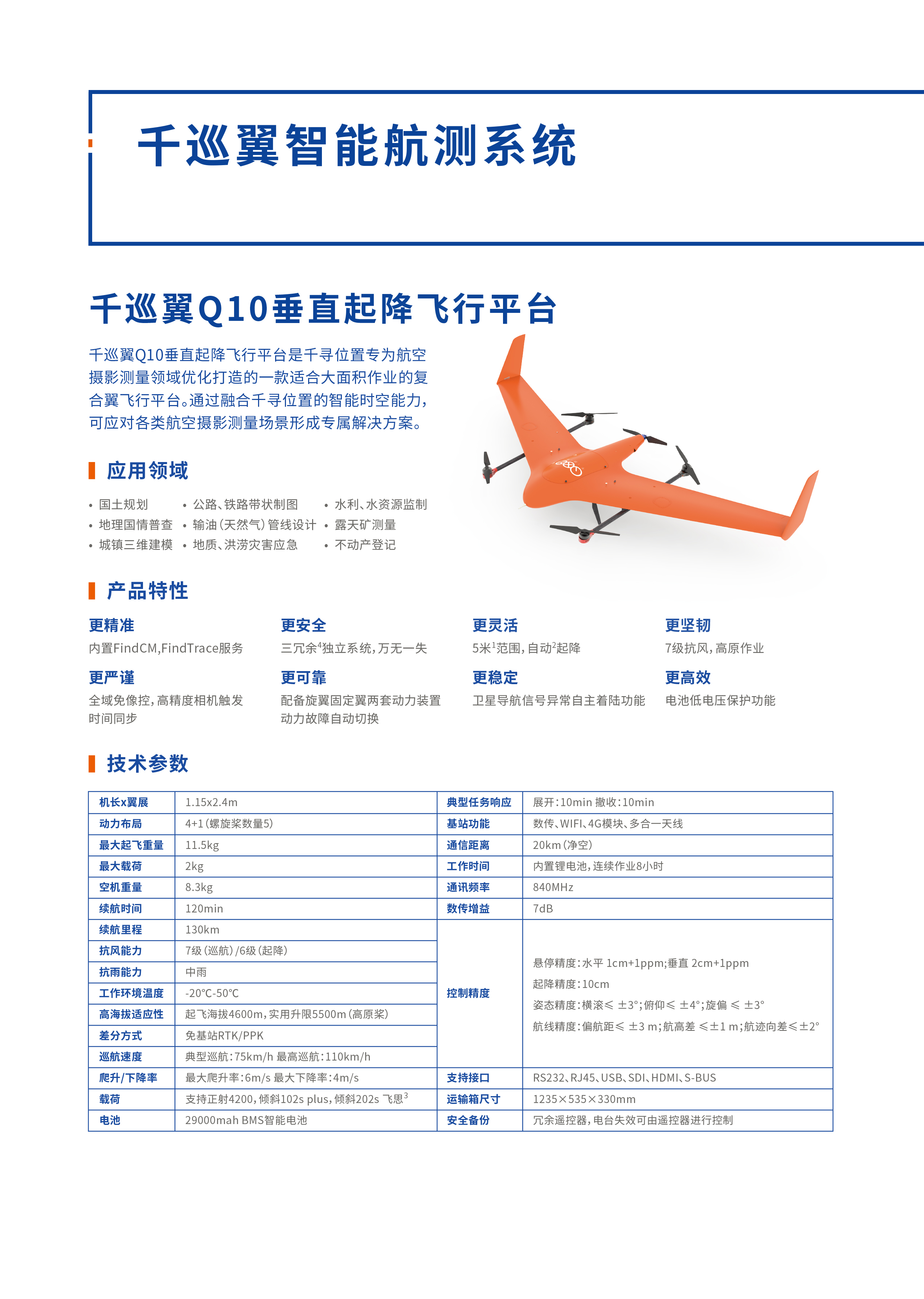 千巡翼Q10垂直起降飛行平臺是千尋位置專為航空攝影測量領域優化打造的一款適合大面積作業的復合翼飛行平臺。通過融合千尋位置的智能時空能力,可應對各類航空攝影測量場景形成專屬解決方案。