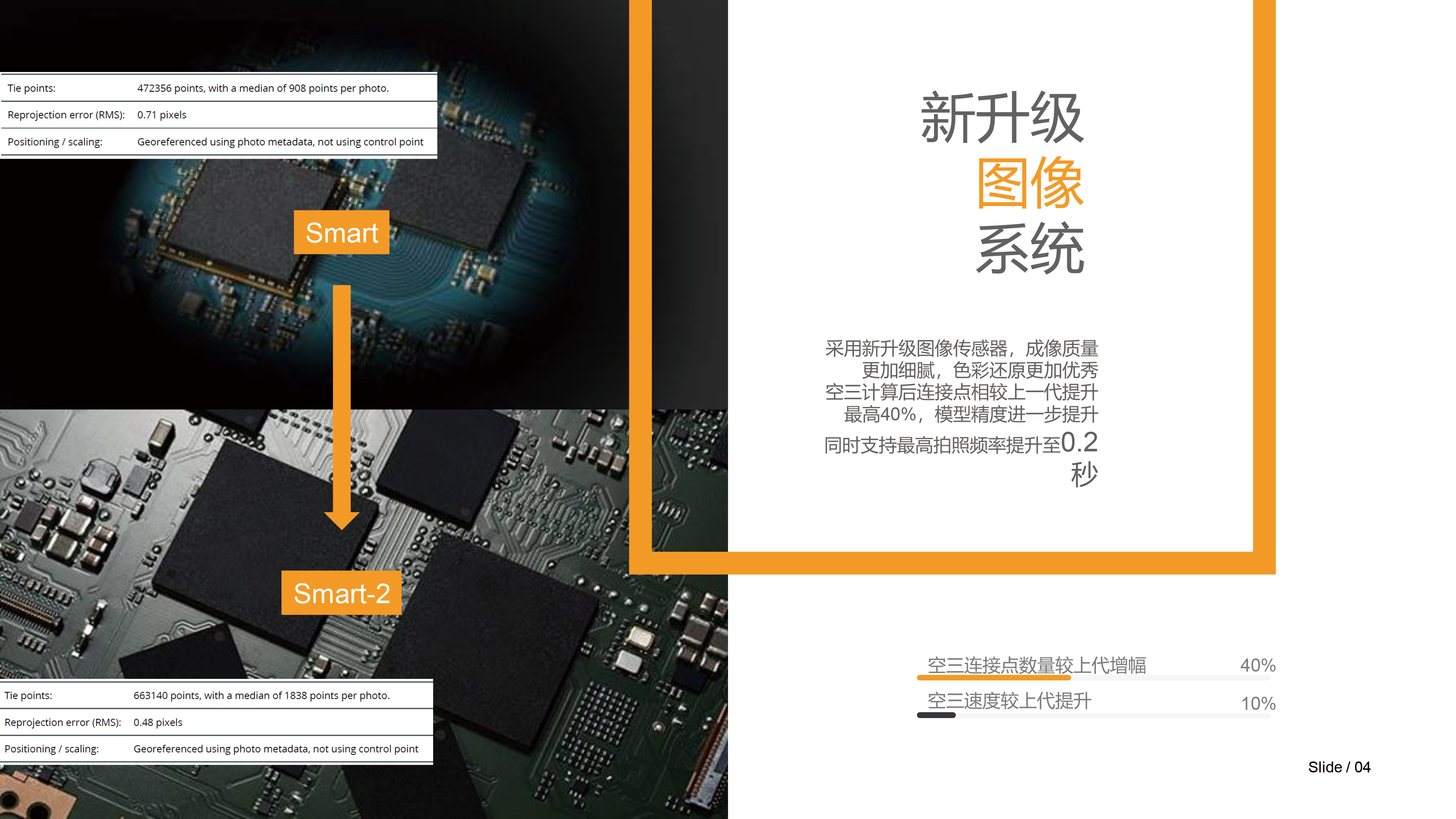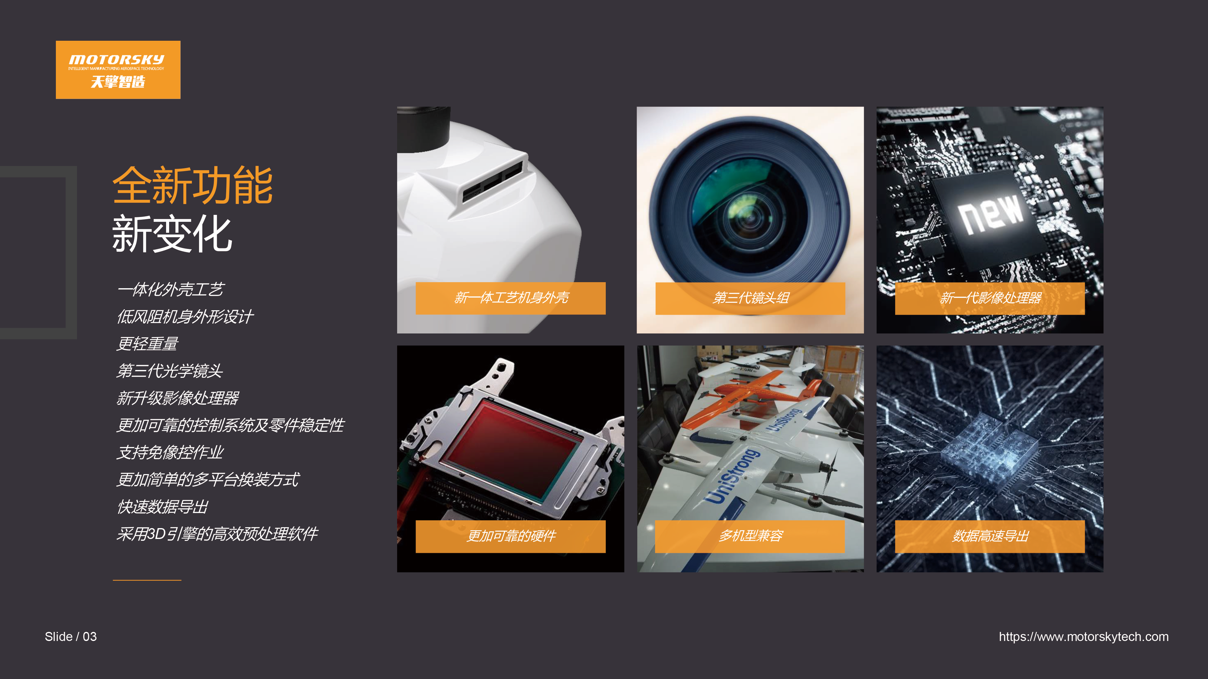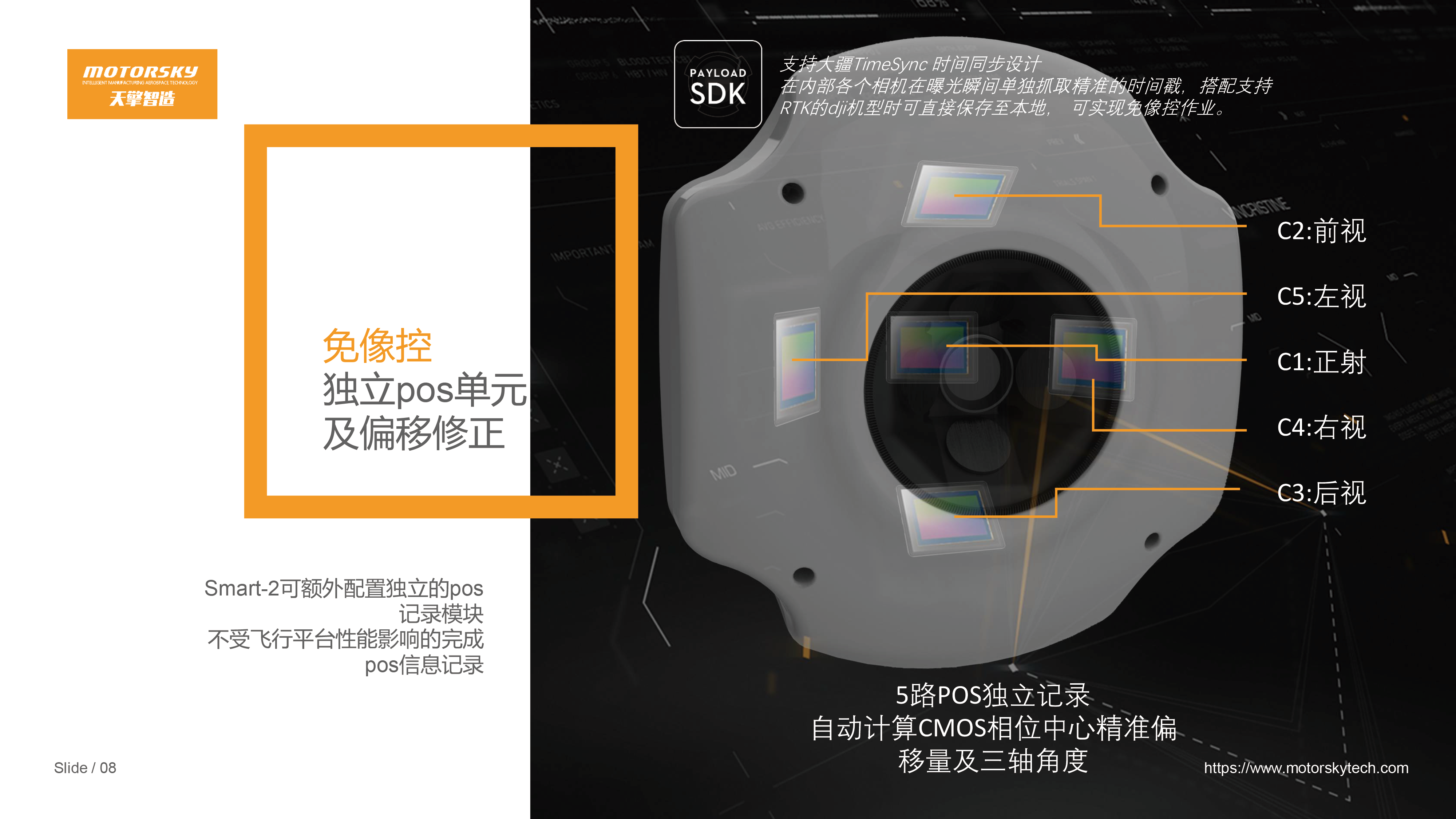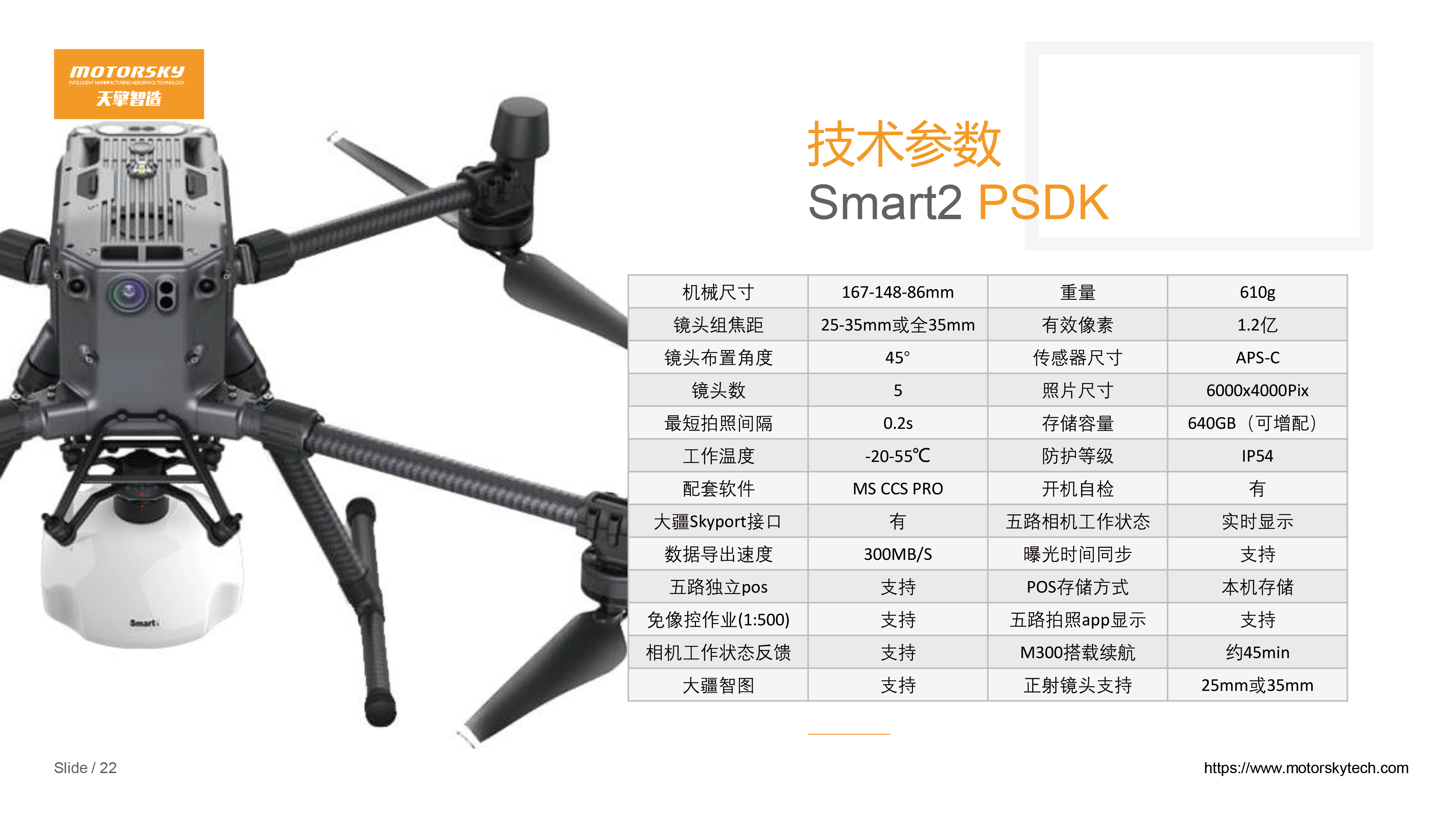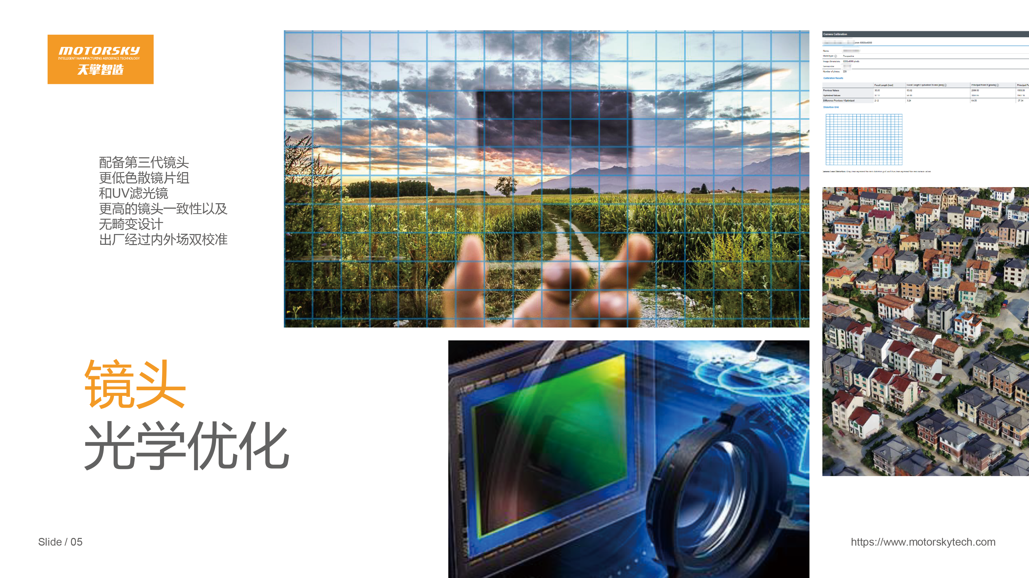 天擎智造MS Smart2傾斜攝影系統采用Motor Sky定制攝影測量型鏡頭,保證鏡頭成像色彩飽滿、畸變更小、銳度更高,內置紅擎溫控專利設計技術,并采用先進的同步全驅技術,可實現相機錯誤自行修復,集成了GPS、慣導等系統,具有體積小、重量輕、高畫質的特點。