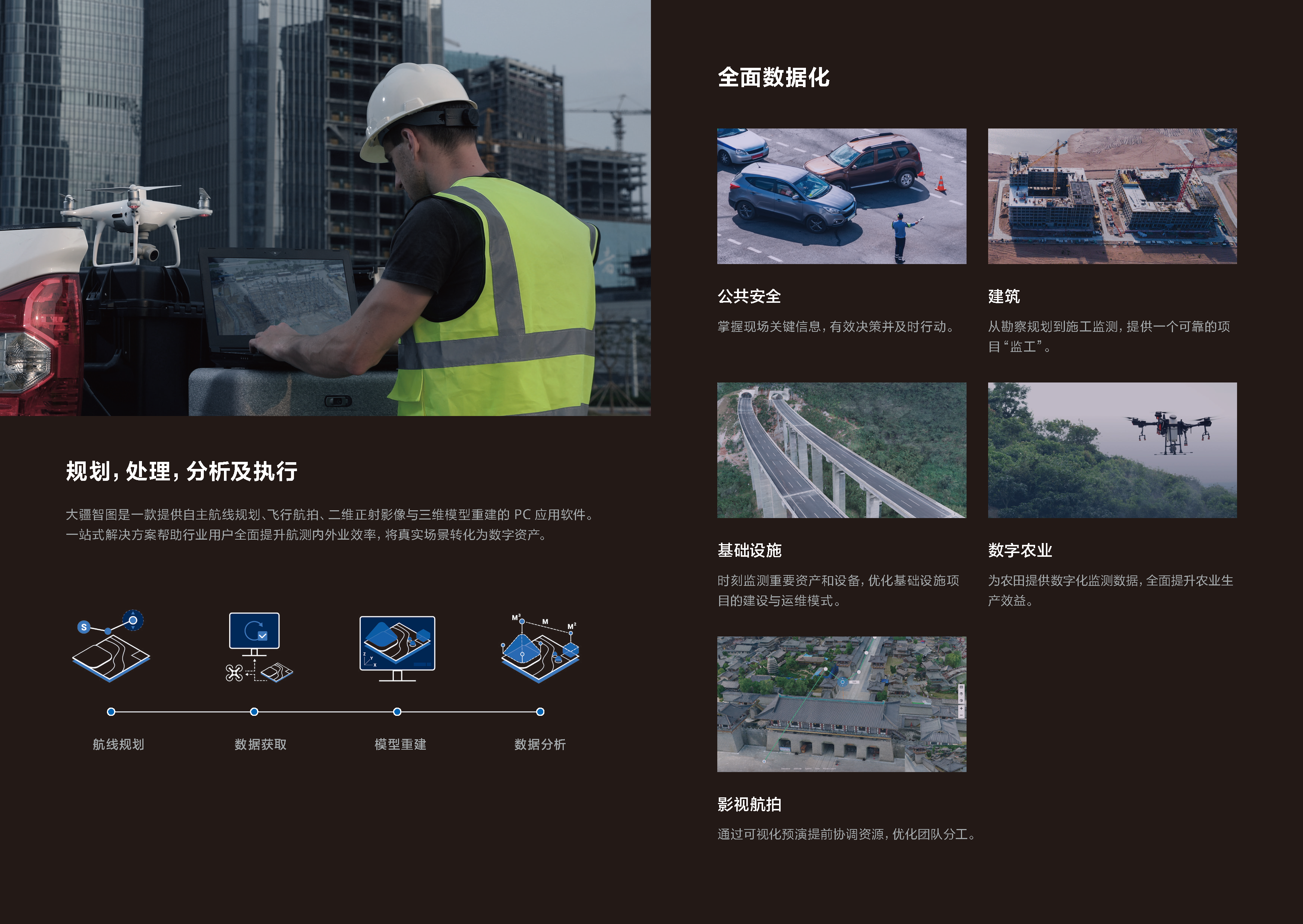大疆智圖是一款提供自主航線規劃、飛行航拍、二維正射影像與三維模型重建的 PC 應用軟件。一站式解決方案幫助行業用戶全面提升航測內外業效率,將真實場景轉化為數字資產。