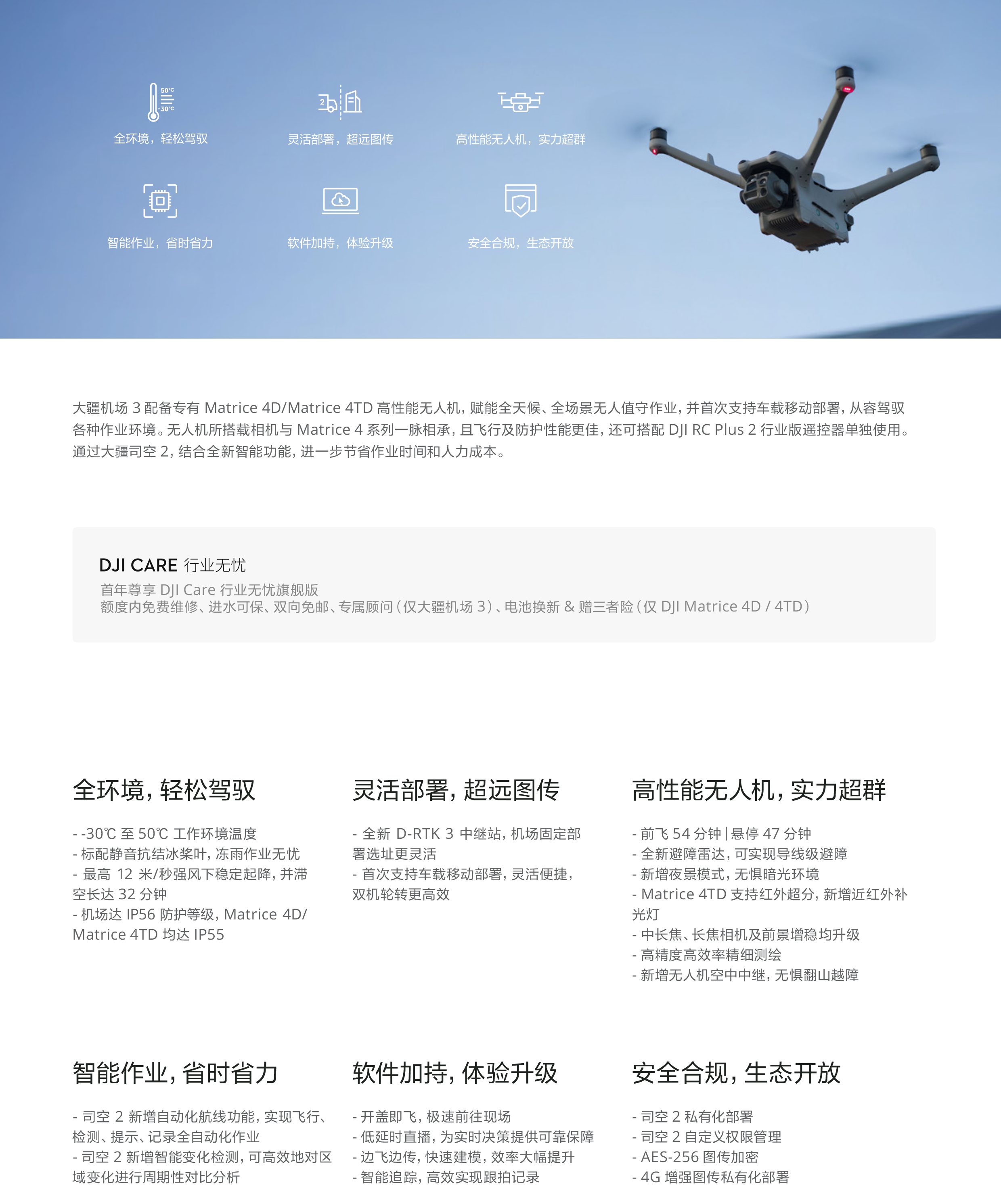 大疆機場具備強大的環境適應性,無論嚴寒酷暑皆可7×24小時無人值守作業。通過大疆司空2 ,遠程制定飛行計劃、自動執行任務,解放繁復勞動。高度一體化設計,支持快速部署。通過大疆司空 2,在云端可對機場進行任務規劃和設備管理,無人機根據任務計劃自動起飛作業,并將作業成果自動上傳歸檔,實現真正的無人化值守。大疆機場配備快充模塊,無人機歸位即充電; TEC空調系統為電池快速降溫。大疆機場3配備專有Matrice 4D/Matrice 4TD高性能無人機,賦能全天候、全場景無人值守作業,并首次支持車載移動部署,從容駕馭各種作業環境。無人機所搭載相機與Matrice 4系列一脈相承,且飛行及防護性能更佳,還可搭配DJI RC Plus 2行業版遙控器單獨使用。通過大疆司空2,結合全新智能功能,進一步節省作業時間和人力成本。